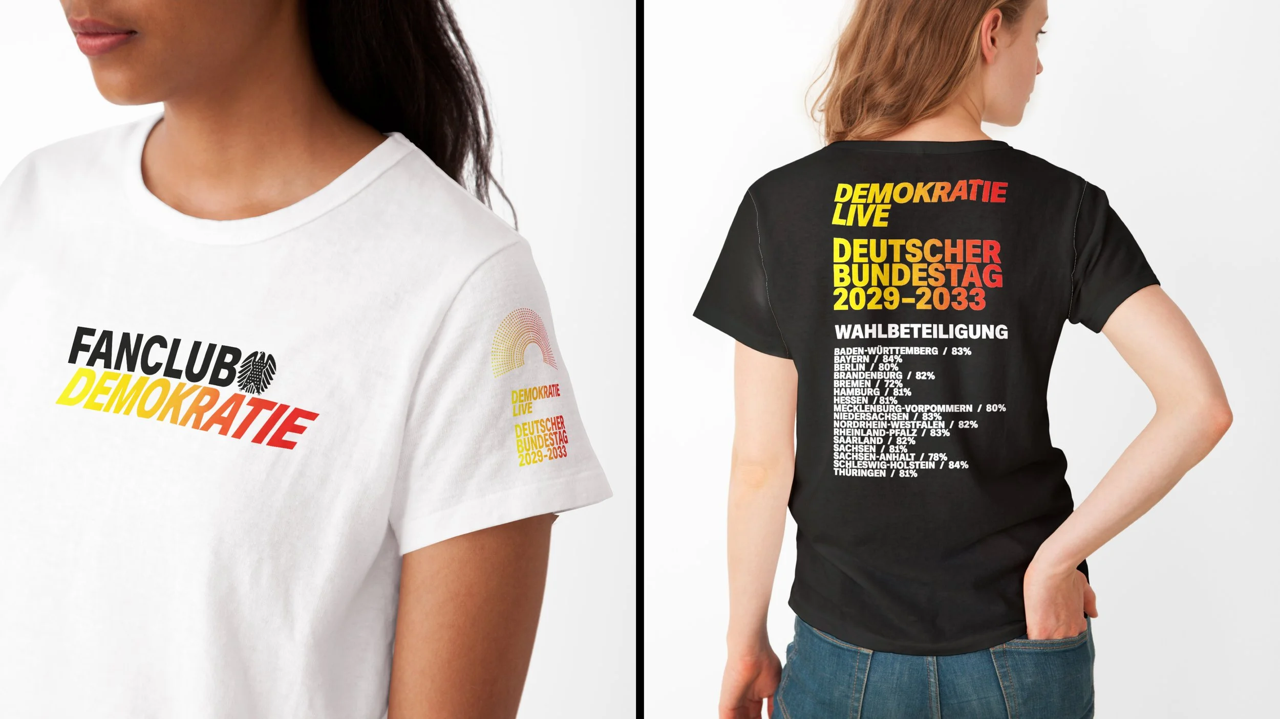 Wählen zu gehen sollte ein freudiger Akt sein. Die Benachrichtigung darüber sollte man sich in Vorfreude wie ein Konzertticket an die Pinnwand heften wollen. Deshalb ist unser Gegenentwurf das Fanticket zur Bundestagswahl 2029: Meine Eintrittskarte zur Demokratie – Live. Das Line-Up: Der Deutsche Bundestag. Veranstalter: Das Grundgesetz. Eintritt: Frei, denn Wählen ist ein Grundrecht. Das ganze komplettiert durch Merchandising, das man auch nach dem Wahltag noch stolz trägt. Und wer ein goldenes Ticket bekommen hat, darf als VIB (Very Important Bürge:in) mit Backstagepass an der konstituierenden Sitzung des neugewählten Bundestages teilnehmen. Aus Wahlberechtigten werden Demokratiefans.